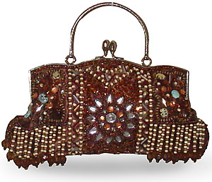 bruine satijen tas/versiering van houten/bruine kraaltjes/knipsluiting